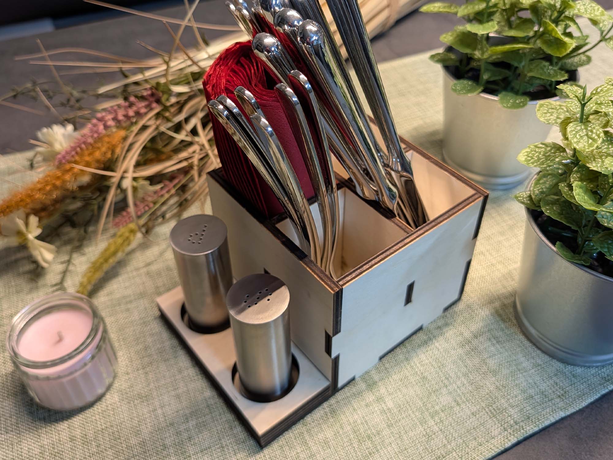 Kleiner Gastro-Halter aus Holz für Besteck, Servietten, Salz & Pfeffer