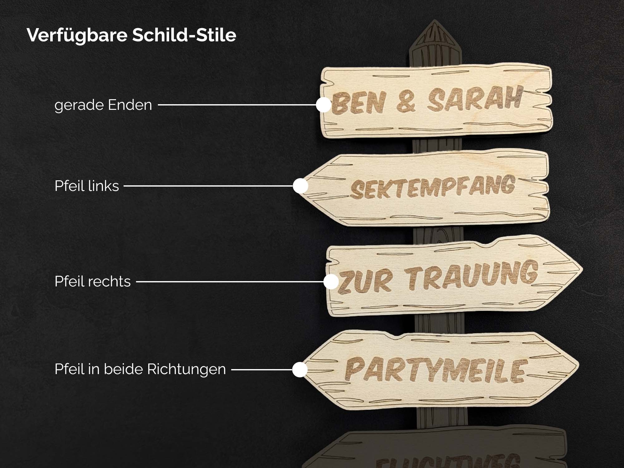 - Hochzeiten & Feiern: Als dekorativer Aufsteller für Hochzeiten, Geburtstage, Taufen oder Jubiläen ist der Wegweiser ein echter Hingucker. Er kann beispielsweise Richtungen wie "Sektempfang", "Party", "Garten" oder "Fotobox" anzeigen und bleibt anschließend ein schönes Erinnerungsstück.