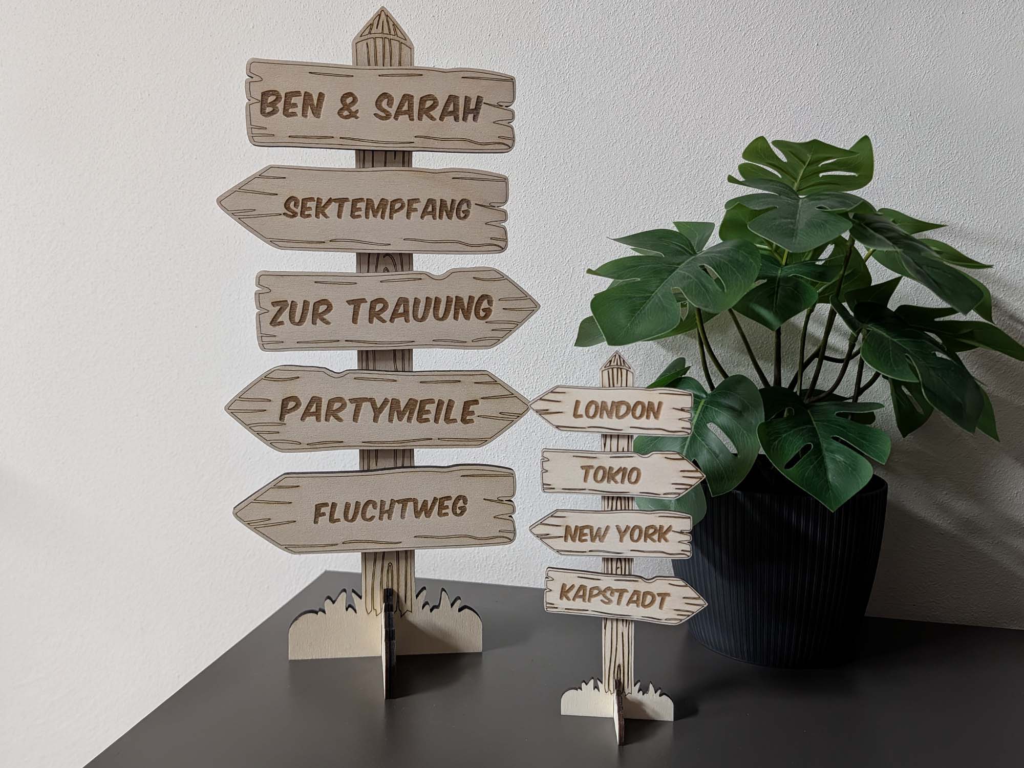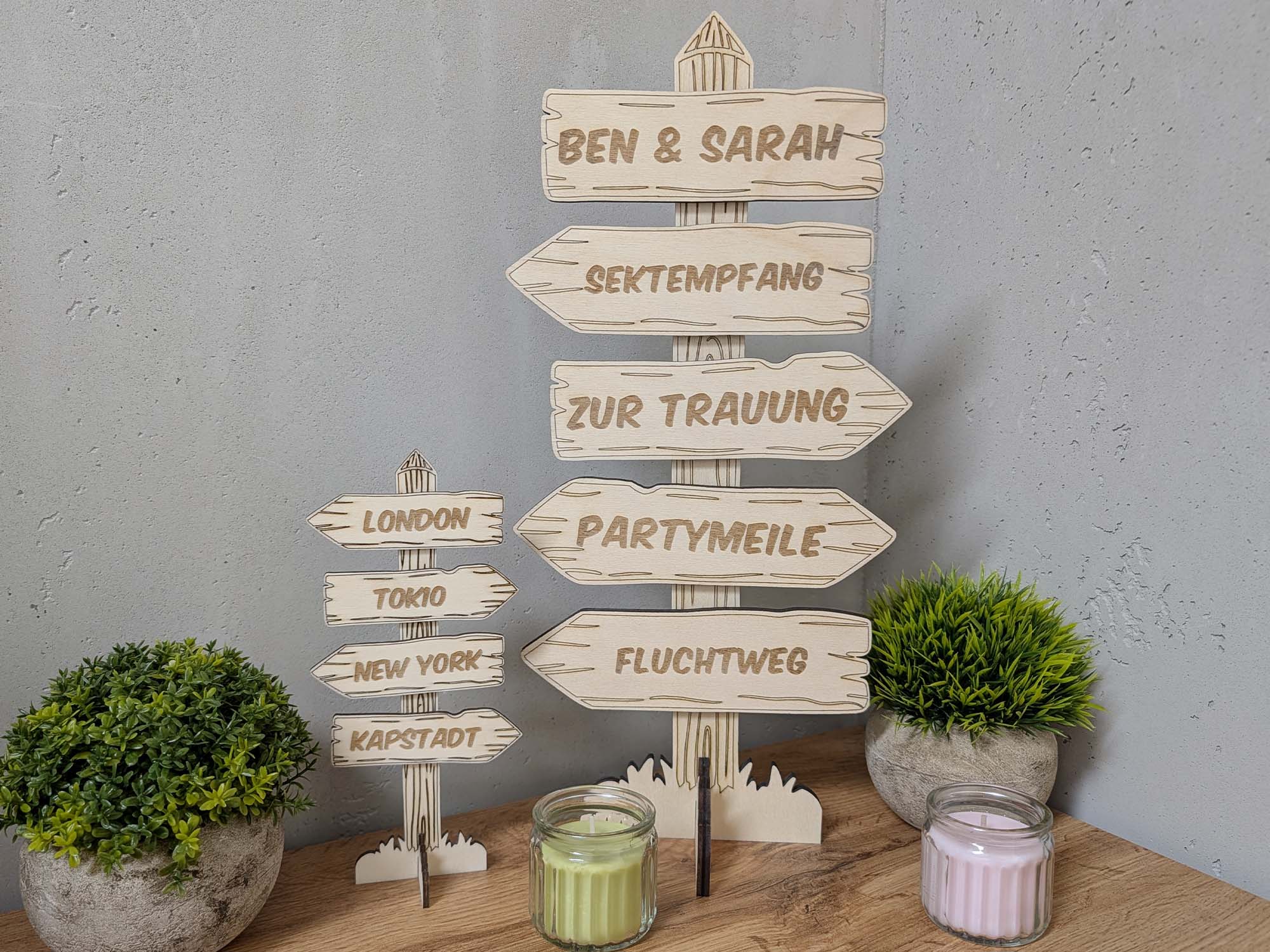 Personalisierbarer Holz-Wegweiser mit Lasergravur. Drei Größen, bis zu fünf Schilder, mit deinem Wunschtext. Ideal für Zuhause, Feiern, Events & Gastronomie.